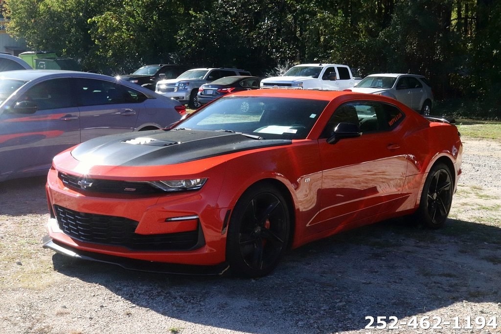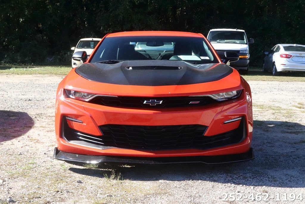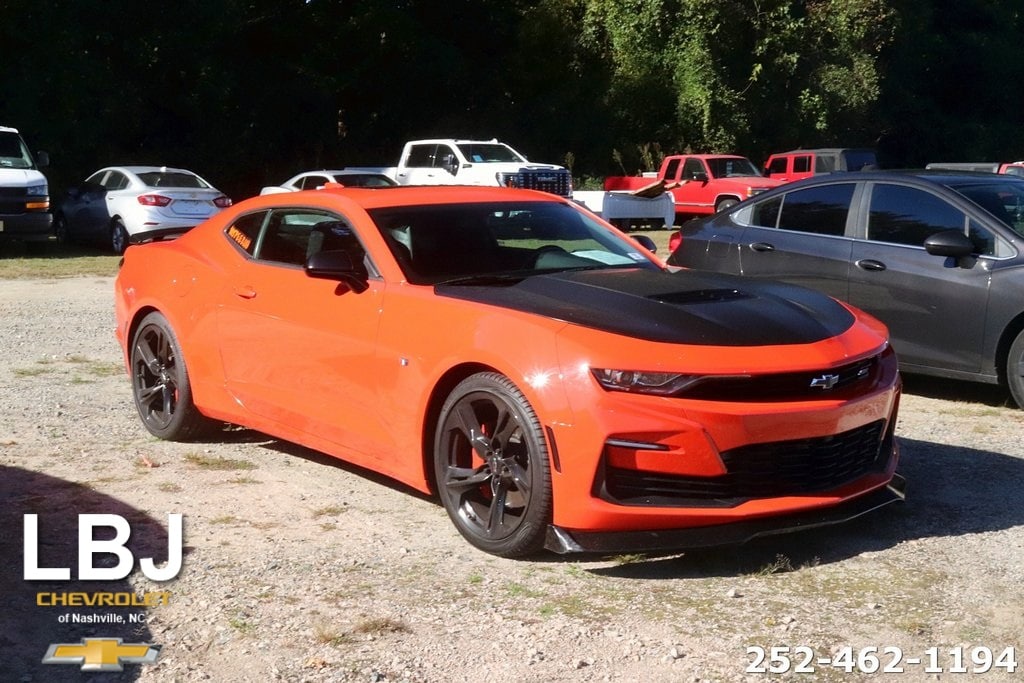 Equipped with Satin Black Appearance Package, 2.77 Rear Axle Ratio, 4-Wheel Disc Brakes, 6 Speakers, 6-Speaker Audio System Feature, 6-Way Power Front Passenger Seat Adjuster, 8-Way Power Driver Seat Adjuster, ABS brakes, Air Conditioning, Alloy wheels, Apple CarPlay/Android Auto, Automatic temperature control, Black Metallic Center Stripe, Bluetooth® For Phone, Brake assist, Bumpers: body-color, Cloth Seat Trim, Compass, Delay-off headlights, Driver door bin, Driver vanity mirror, Dual front impact airbags, Dual front side impact airbags, Dual Mode Exhaust, Electronic Stability Control, Exterior Parking Camera Rear, Four wheel independent suspension, Front anti-roll bar, Front Bucket Seats, Front Center Armrest, Front reading lights, Front Sport Bucket Seats, Fully automatic headlights, Illuminated entry, Illuminated Sill Plates (LPO), Knee airbag, Leather Shift Knob, Low tire pressure warning, Occupant sensing airbag, Orange-Painted Calipers, Overhead airbag, Paddle-Shift Manual Controls, Panic alarm, Passenger door bin, Passenger vanity mirror, Power door mirrors, Power driver seat, Power passenger seat, Power steering, Power Sunroof, Power windows, Premium audio system: Chevrolet Infotainment System, Radio data system, Radio: Chevrolet Infotainment 3 Plus System, Rear anti-roll bar, Rear window defroster, Remote keyless entry, Remote Vehicle Starter System, Security system, SiriusXM w/360L, Speed control, Speed-sensing steering, Steering wheel mounted audio controls, Tachometer, Telescoping steering wheel, Tilt steering wheel, Traction control, Trip computer, Variably intermittent wipers, and Voltmeter