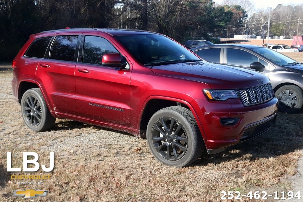 Equipped with Altitude Appearance Package (Altitude Grille, Body Color Claddings, Body Color Fascia, Body Color Shark Fin Antenna, Dark Day Light Opening Moldings, Dark Headlamp Bezel Finish, Dark Lens Taillamps, Delete Laredo Badge, Front Accent/Body Color Fascia, Gloss Black Jeep Badging, Gloss Black Rear Fascia Applique, Hill Descent Control, Quadra-Trac II 4WD System, Rear Accent/Body Color Fascia, Rear Fascia Black Molded in Color Step Pad, Selec-Terrain System, Single Exhaust w/Bright Tip, and Wheels: 20" x 8.0" Gloss Black Aluminum), Quick Order Package 2GM Laredo X (DISC) (115V Auxiliary Power Outlet, Black Suede Seats w/Black Stitching, Heated Front Seats, Heated Steering Wheel, Power Liftgate, Remote Start System, Security Alarm, Steering Wheel Mounted Audio Controls, and Universal Garage Door Opener), Tech Group (506 Watt Amplifier, Active Noise Control System, Auto High Beam Headlamp Control, Bi-Xenon High-Intensity Discharge Headlamps, Front LED Fog Lamps, LED Daytime Running Headlamps, and Premium Alpine Speaker System), Trailer Tow Group IV (180 Amp Alternator, 7 & 4 Pin Wiring Harness, Class IV Receiver Hitch, Heavy-Duty Engine Cooling, and Rear Load Leveling Suspension), 3.45 Rear Axle Ratio, 4-Wheel Disc Brakes, 6 Speakers, ABS brakes, Air Conditioning, Alloy wheels, AM/FM radio: SiriusXM, Anti-whiplash front head restraints, Apple CarPlay/Android Auto, Auto-dimming Rear-View mirror, Automatic temperature control, Brake assist, Bumpers: body-color, Cloth Bucket Seats, Compass, Delay-off headlights, Driver door bin, Driver vanity mirror, Dual front impact airbags, Dual front side impact airbags, Electronic Stability Control, Emergency communication system: SiriusXM Guardian, Four wheel independent suspension, Front anti-roll bar, Front Bucket Seats, Front Center Armrest w/Storage, Front dual zone A/C, Front fog lights, Front reading lights, Fully automatic headlights, Heated door mirrors, Illuminated entry, Knee airbag, Leather Shift Knob, Low tire pressure warning, Navigation System, Normal Duty Suspension, Occupant sensing airbag, Outside temperature display, Overhead airbag, Overhead console, Panic alarm, ParkView Rear Back-Up Camera, Passenger door bin, Passenger vanity mirror, Power door mirrors, Power driver seat, Power steering, Power Sunroof, Power windows, Radio data system, Radio: Uconnect 4C Nav w/8.4" Display, Rear anti-roll bar, Rear reading lights, Rear seat center armrest, Rear window defroster, Rear window wiper, Remote keyless entry, Speed control, Speed-sensing steering, Speed-Sensitive Wipers, Split folding rear seat, Spoiler, Steering wheel mounted audio controls, Tachometer, Telescoping steering wheel, Tilt steering wheel, Traction control, Trip computer, Variably intermittent wipers, and Wheels: 18" x 8.0" Fine Silver Aluminum
